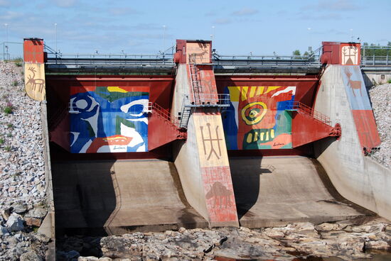 Kurz bevor wir Jokkmokk erreichten, kamen wir an einem Damm vorbei, dem Akkats kraftverk. Die Luken und das Gebäude sind als Kunstwerk bemalt. Es heißt „Uvssat davás“, was „Die Türen nach Westen“ bedeutet, obwohl die Tore nach Süden weisen.