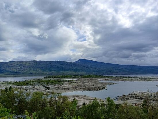 In der Fjällstation machten wir Fika (Kaffe und Kuchen). Von dort hatten wir einen schönen Blick auf die Erweiterung des Stausees Akkajaure und den Berg Akka. Dahinter zogen dunkle Wolken auf, die es aber nicht zu uns hinüber schafften. Mehrfach flogen Hubschrauber mit Außenlast vorbei. Sie ver- und entsorgen wohl unzugängliche Hütten.