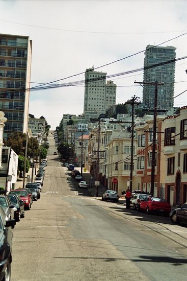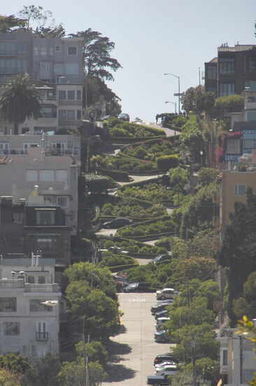 Die Lombard Street ist die Strasse die paar Kilometer weiter östlich in engen Kurven von jeden Touristen befahren wird.