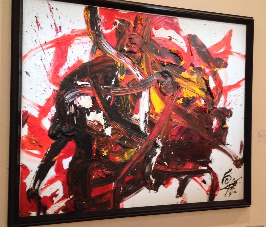 hierzu läuft im Museum ein Video, in dem der Künstler am Seil schwingend die Farbe pfundweise mit den Füßen auf die Leinwand bringt