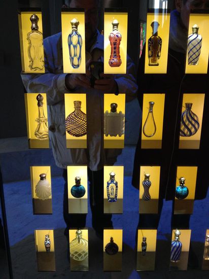 Im wahrsten Sinne umwerfend ist die Installation im Bad, wo Parfümfläschchen gezeigt werden, man aber trockenen Fußes in plätscherndem Wasser umhertritt.
