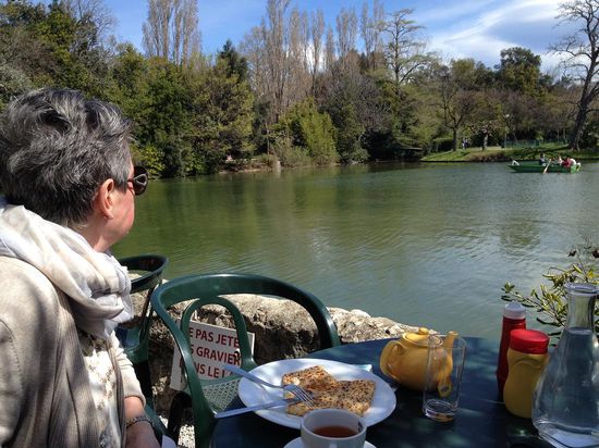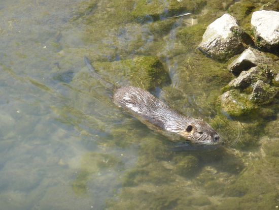 Eigentlich will ich durch einen Nordausgang Richtung Corbusier-Haus, den scheint es aber nicht zu geben und wir wollen einen Tee trinken. Das zum Schloß gehörende Café ist rappelevoll, hat gesalzenen Preise und lärmende Kinder, wir verziehen uns und finden am See ein lauschiges Plätzchen, zwar auch gut besucht aber ruhig und mit Blick auf den See im Park. Ulrike sieht einen Biber im See schwimmen, ist sich aber nicht ganz sicher. Später sehen wir mehrere im Kanal.