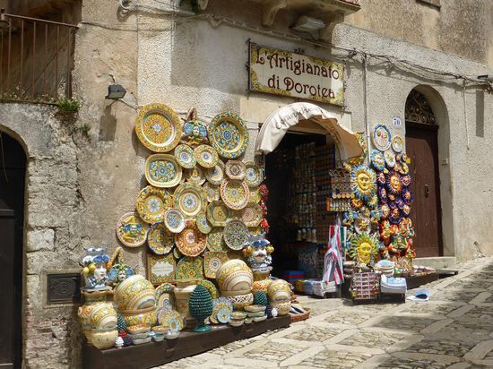 Der heute ruhige Ort wird wohl in der Hochsaison recht touristisch sein, denn die zahlreichen Souvenirläden haben z.T. schöne Auslagen mit hübschen Keramiken - aber wir sind seit Jahren 'wegen Überfüllung' resistent.