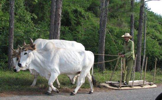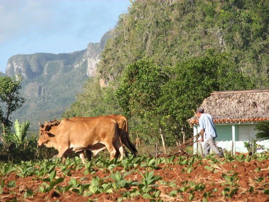 Bald erreichen wir ein Tabakfeld, an dem ein Tabakbauer gerade pflügt. Sein Mitstreiter war ein paar Jahre in Dresden und wir müssen ihm natürlich Rede und Antwort stehen für seine vielen Fragen. Natürlich bietet er auch selbst gedrehte Zigarren an und ein Päckchen schwarzgebrannten Kaffee, der ganz in der Nähe auch gedeiht.