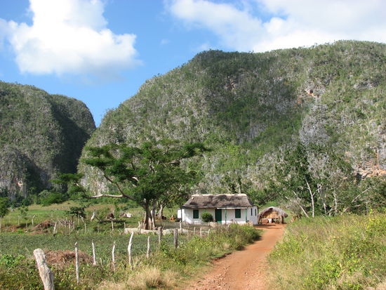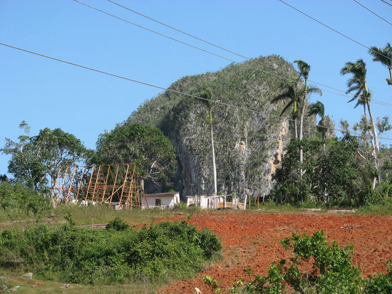 Felder und wiederaufgebauter - noch nicht vollendeter - Schuppen zur Tabaktrocknung - vor einem/r 'Mogote'