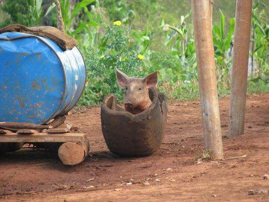 Doch eine Wildschweinfamilie und ein im Faß ruhendes großes Hausschwein versperren uns den Weg, so dass wir sie großräumig umgehen müssen.